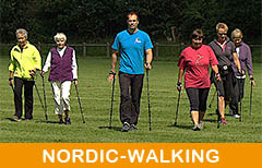 | Nordic Walking ist eine effektive, aber moderate und wenig verletzungsanfällige Outdoor-Sportart, die sich vor allem auch für Sporteinsteiger eignet. Ähnlich dem Bewegungsablauf beim Skilanglauf verbindet Nordic Walking die Gehbewegung der Beine mit der diagonalen Bewegung der Arme und dem Einsatz von Stöcken. Die schwungvolle Bewegung beansprucht Herz und Kreislauf, stärkt Muskeln und Knochen und sorgt für purzelnde Pfunde. | |