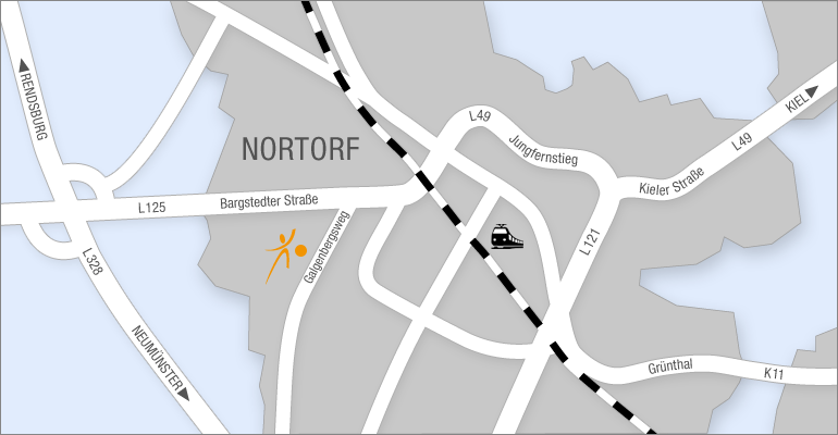 Aus Richtung Kiel: Sie passieren das Ortsschild Nortorf, nach der nächsten Fußgängerampel biegen Sie rechts in den Jungfernstieg. Fahren Sie immer geradeaus. Nachdem dem Bahnübergang fahren Sie noch ca. 150m, dann biegen Sie links in den Galgenbergsweg ab.