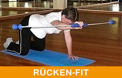 | Fast jeder hat schon seine leidlichen Erfahrungen mit ihnen gemacht - die Rückenschmerzen. Durch Bewegungsmangel und Fehlhaltungen treten Verschleißerscheinungen und Muskel- verspannungen auf. Im Rückenfit-Kurs können Sie die gesamte Muskulatur des Torsos stärken und so Rückenschmerzen vorbeugen und entgegenwirken. Mit einer Vielzahl von Kleingeräten und passender Musik ist für Abwechslung gesorgt! | |